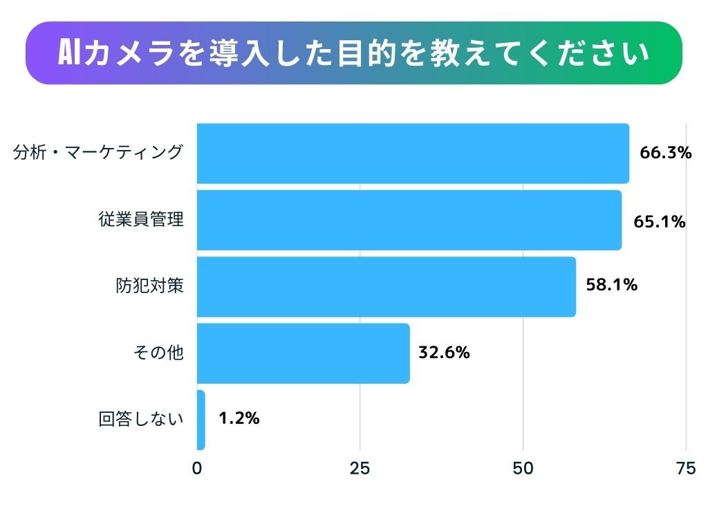 僅差ですが【分析・マーケティング】が最も理由として多い結果になりました。ただ撮るだけではなく、顔や性別年齢から行動まで追うことのできるAIカメラは客行動の分析やマーケティングとの親和性が高いのでしょう。