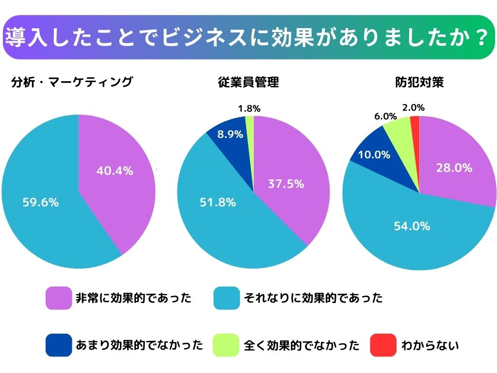 【分析・マーケティング】目的で導入した方では、なんとすべての方が効果を感じているようです。特に人の目だけではカバーできない領域において、AIカメラの効果は顕著に感じられることでしょう。