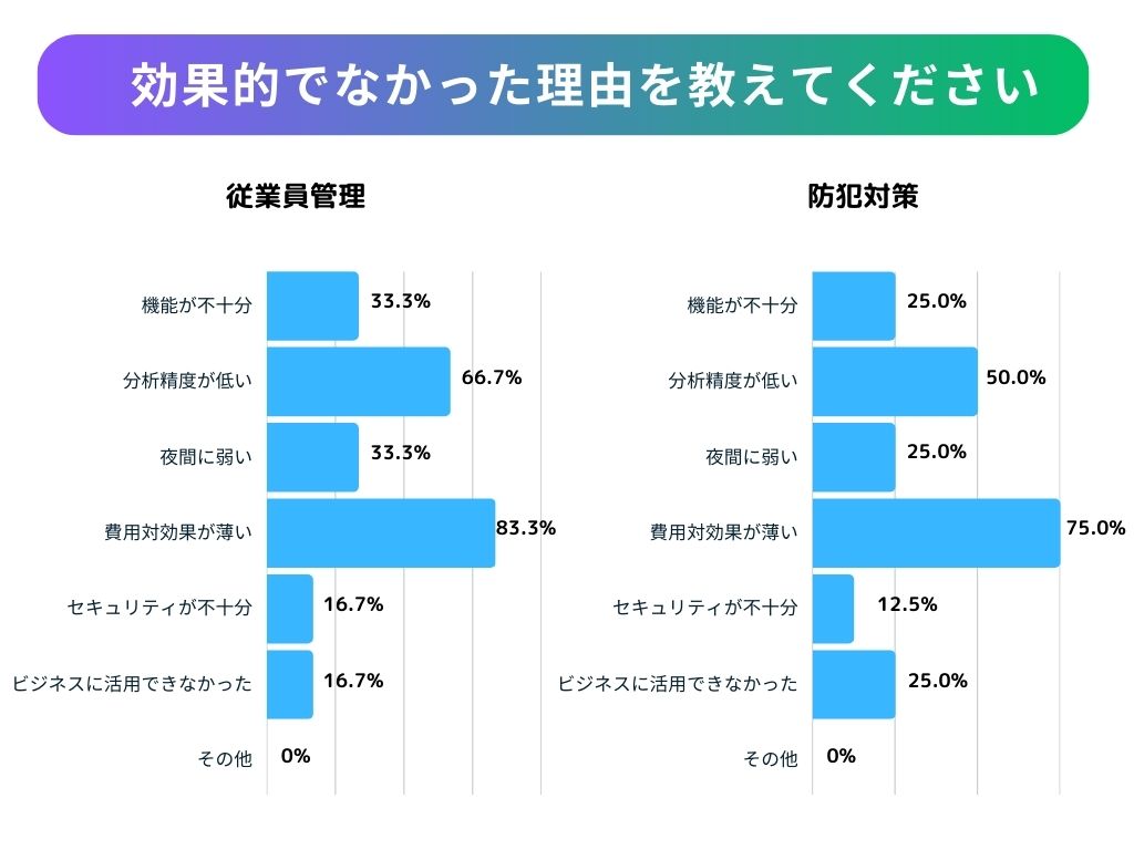 【従業員管理】と【防犯対策】目的で導入した方の1~2割ほどは、効果を感じられなかったようです。ではなぜ効果を感じられなかったのか、気になる理由を見ていきましょう。
