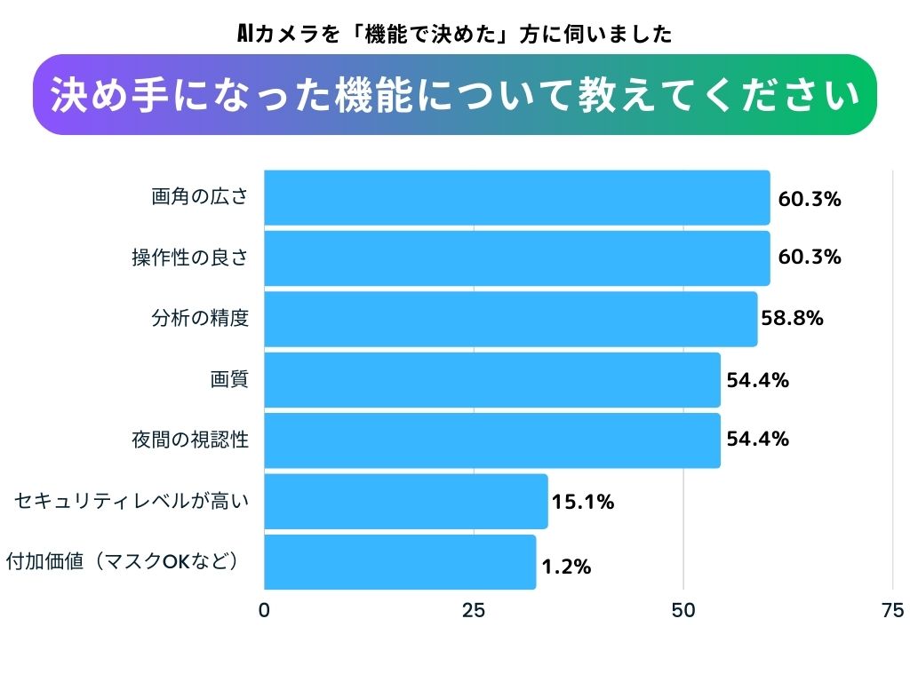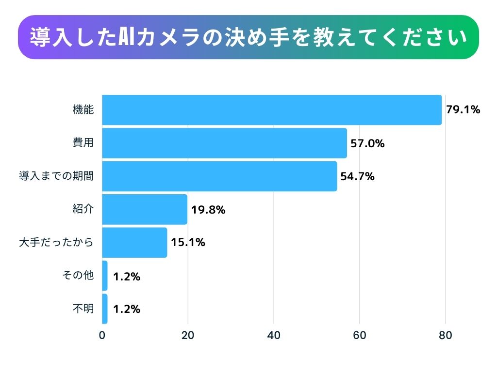 【機能】が一番の決め手になったという結果になりました。続いて【費用】【導入までの期間】が並びます。映像を映すだけであれば費用面や導入期間にもこだわりたいですが、やはりAIカメラである以上は機能を最も重視したいところです。
